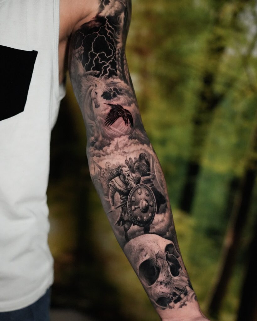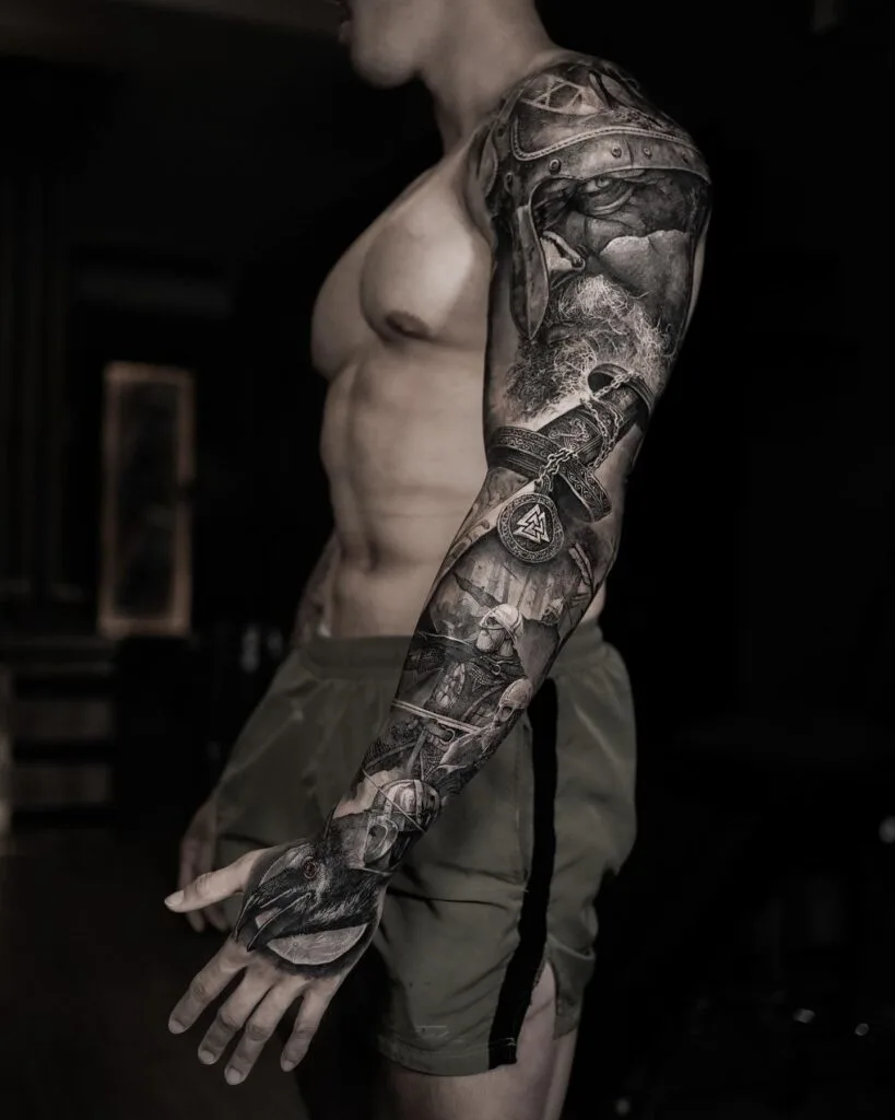Battle scenes fill the mid-section, showing warriors with shields ready for combat. Near the wrist, a striking raven appears with a sharp gaze, grounding the design in Norse myth. This sleeve honors bravery, legacy, and the spirit of Viking warriors.
