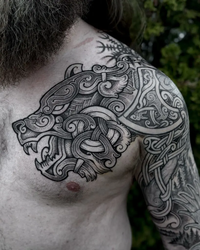 This Viking tattoo features a bold knotwork bear stretching across the chest and shoulder. The design uses flowing interwoven lines that create a fierce bear head filled with movement and detail. The artist added dot-shading to give the knots depth without losing the clean, carved look.