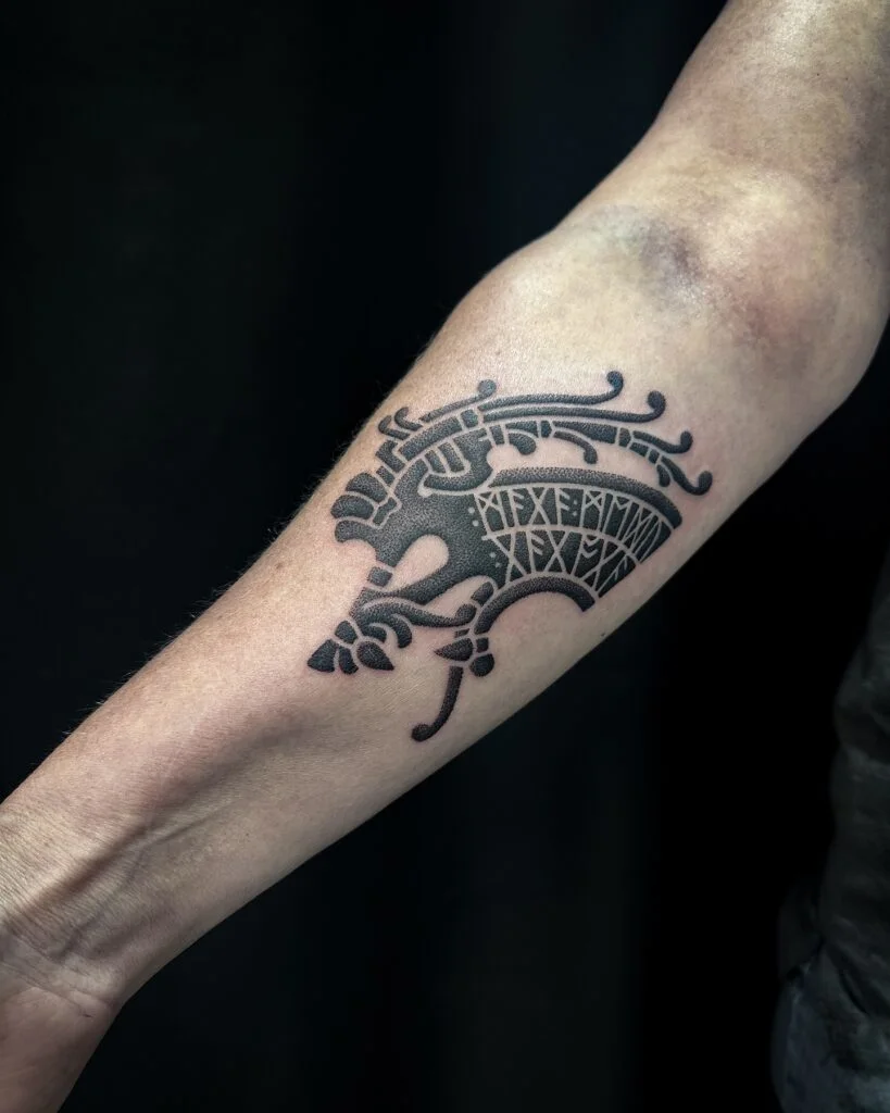 This Viking tattoo shows a bold, stylized dragon head created with clean black lines and sharp geometric shapes. The design blends traditional Norse curves with modern precision, giving the dragon a strong, graphic look. Runes fill the center panel, adding a meaningful message that personalizes the piece.