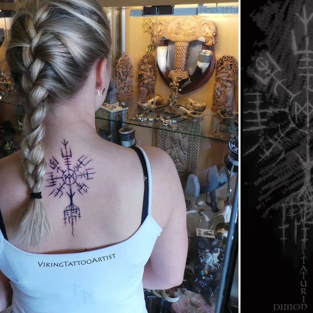 This Viking tattoo places a delicate Vegvisir design at the center of the upper back, giving it a meaningful yet subtle presence. The artist kept the lines thin and natural, which creates a soft, hand-drawn look that suits the placement well.