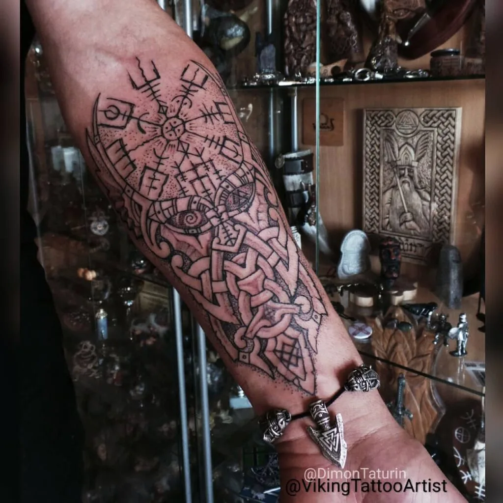 This Viking tattoo features a fierce wolf head combined with a bold Vegvisir symbol at the center of the forearm. The artist used flowing lines to build the wolf’s fur, creating movement and a sense of untamed power. Around the Vegvisir, a ring of runes adds meaning and strengthens the protective theme.