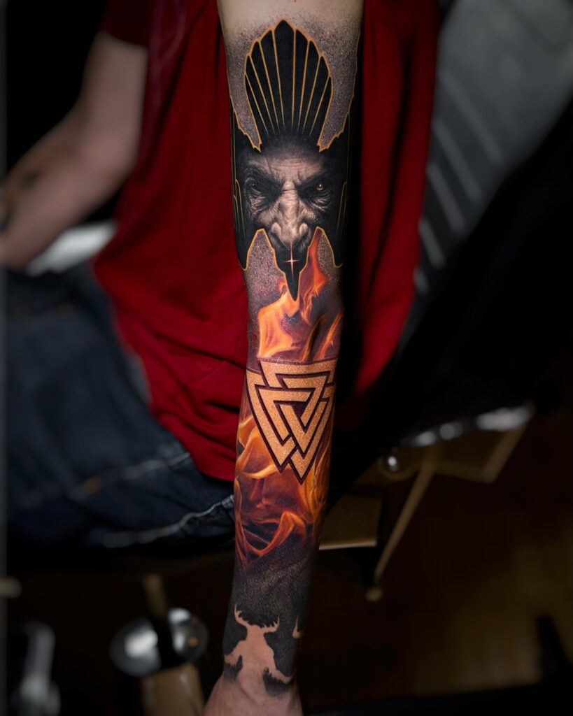 This Viking tattoo features a fierce warrior’s face framed by bold, angular lines that create a strong, commanding presence. The artist placed the face above vibrant flames, which rise dramatically along the forearm and add energy to the design.