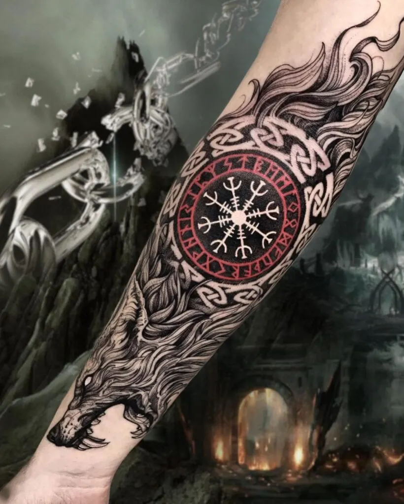 This Viking tattoo features a fierce wolf head combined with a bold Vegvisir symbol at the center of the forearm. The artist used flowing lines to build the wolf’s fur, creating movement and a sense of untamed power. Around the Vegvisir, a ring of runes adds meaning and strengthens the protective theme.