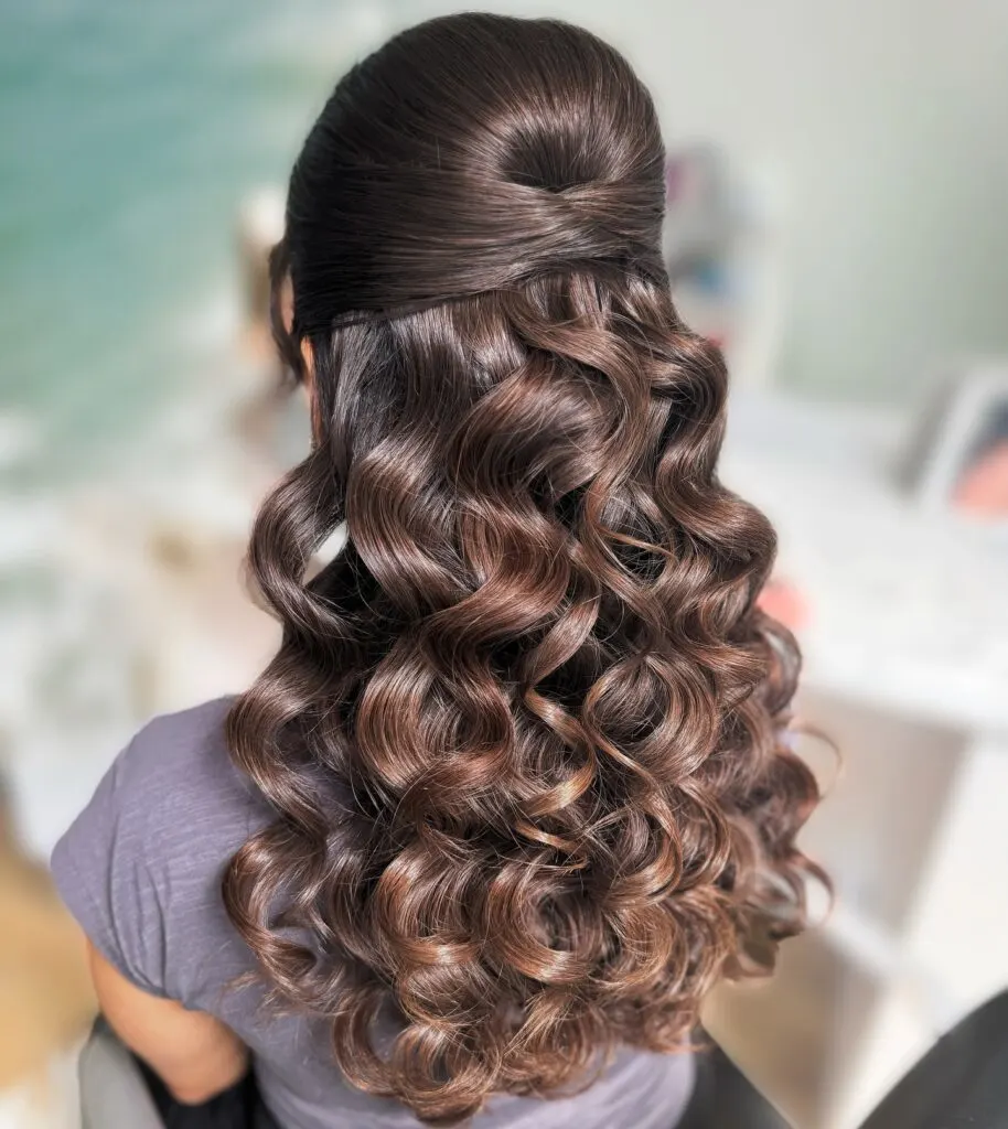 This romantic half-up hairstyle features soft twists that meet at the back, creating a delicate and feminine shape. The voluminous curls flow gracefully, giving the hair natural bounce and movement. Subtle height at the crown adds structure while keeping the overall look relaxed and timeless.