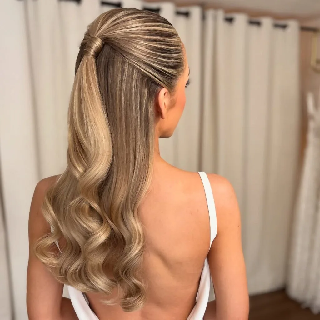 This sleek half-up ponytail exudes modern sophistication with a touch of classic bridal grace. The hair is smoothed and lifted at the crown, then wrapped seamlessly with a strand for a polished finish. Soft, structured waves flow beautifully down the back, adding movement and shine.
