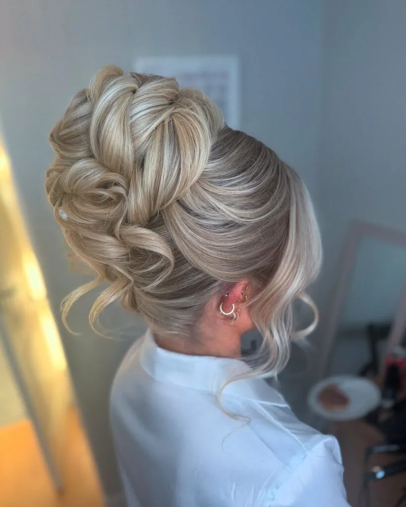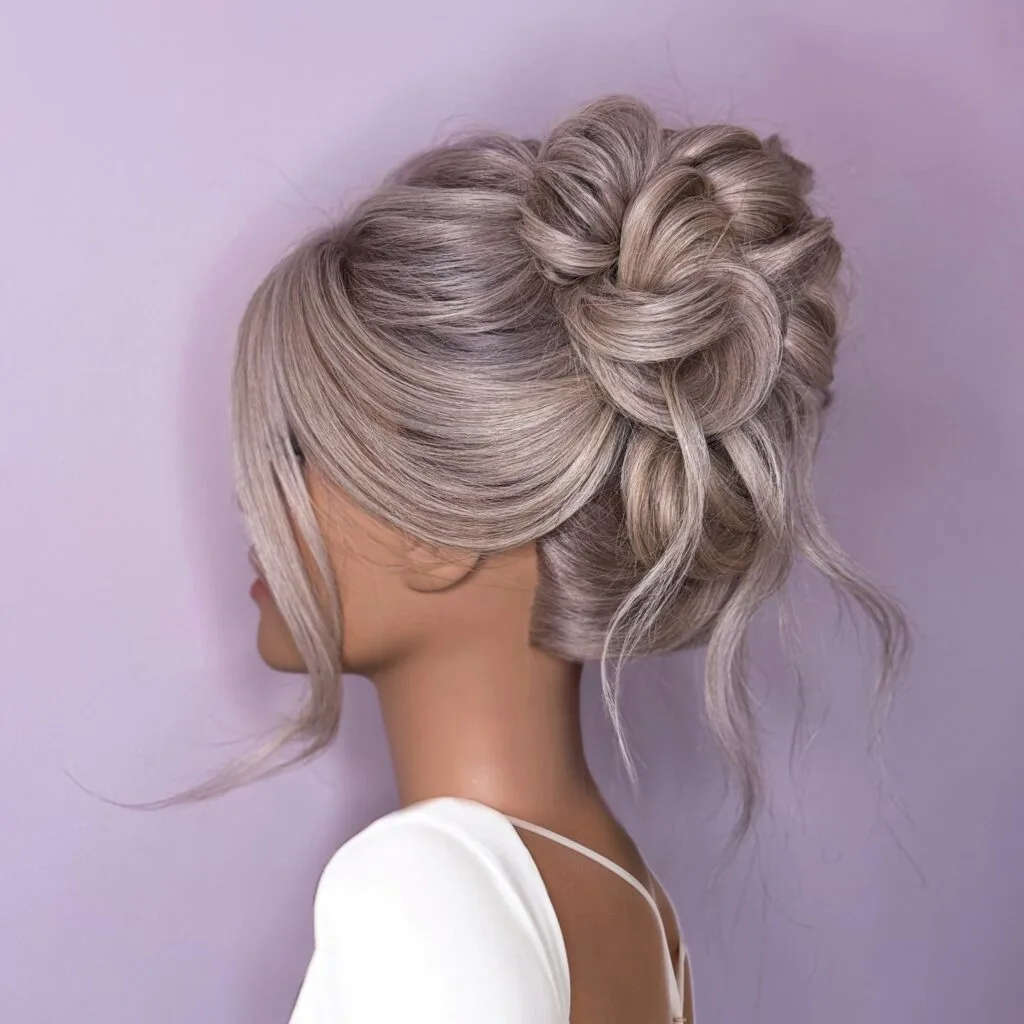 This romantic twisted updo blends volume, texture, and elegance beautifully. The hair is softly gathered and styled into intricate loops, giving the bun dimension and a graceful flow. Loose strands frame the face, softening the look and adding movement.