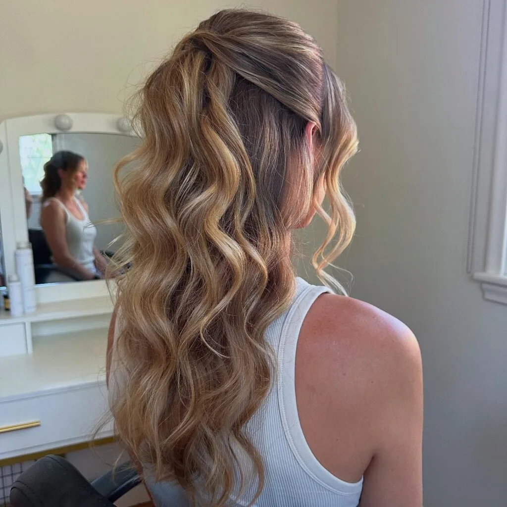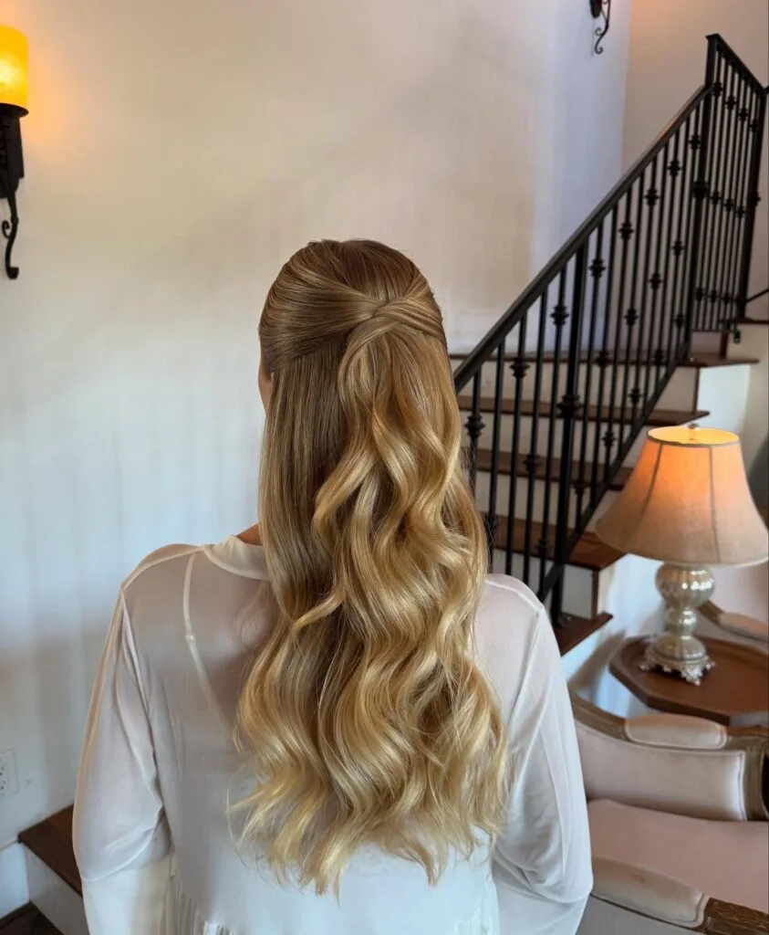 This soft half-up hairstyle combines effortless romance with timeless elegance. The hair is gently twisted at the back, creating a seamless blend of structure and flow. Polished waves cascade down, reflecting light beautifully and adding volume without feeling heavy.