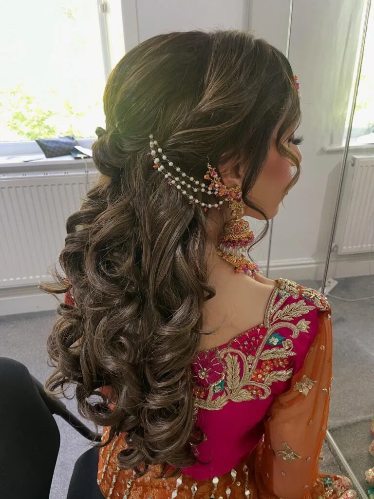 Intricate hair jewelry featuring pearls and beads drapes gracefully along the side, adding cultural charm and sophistication. Loose tendrils around the face soften the look, enhancing the bride’s natural beauty. This style complements richly embroidered outfits, making it perfect for cultural or multi-day wedding celebrations.