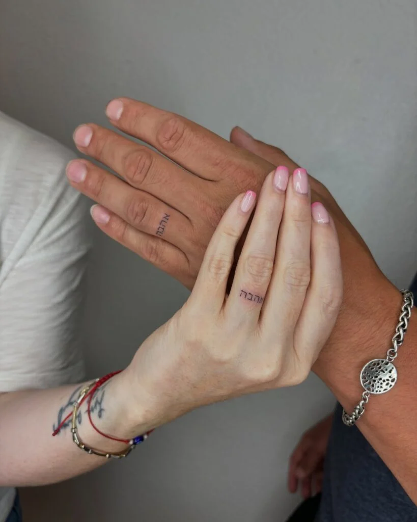 This meaningful couple tattoo replaces traditional wedding bands with Hebrew script inked on the inner ring fingers. The woman’s tattoo reads “אהבה” (Ahava), meaning “love,” while the man’s tattoo complements it with what appears to be a corresponding word in Hebrew, likely signifying commitment or affection.