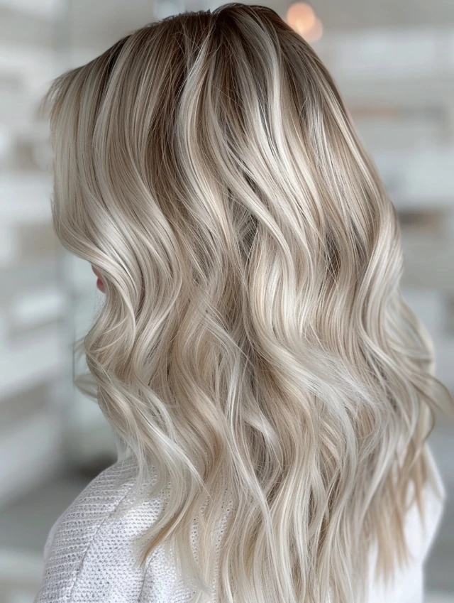 Platinum balayage adds icy streaks to blonde hair, creating a multi-dimensional winter effect. Works for oval and round faces, elongating features and adding movement. Fine hair appears thicker, while thick hair gains texture and depth.