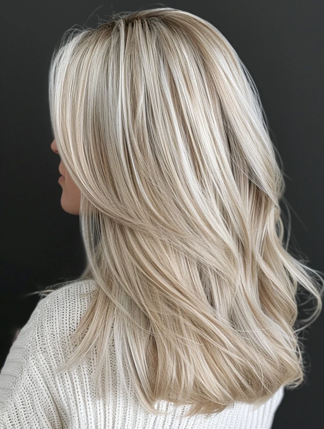 Icy platinum highlights give blonde hair a cool, sophisticated winter look. Works for oval and heart-shaped faces, brightening skin and emphasizing facial features. Fine hair appears thicker with subtle icy tones blended throughout.