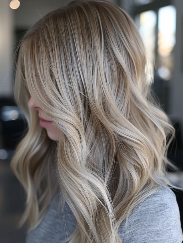 Ash blonde lowlights add contrast to bright blonde hair for a subtle, sophisticated winter look. Works for oval and heart-shaped faces, framing features and softening angles. Fine hair appears thicker, while thick hair gains movement.