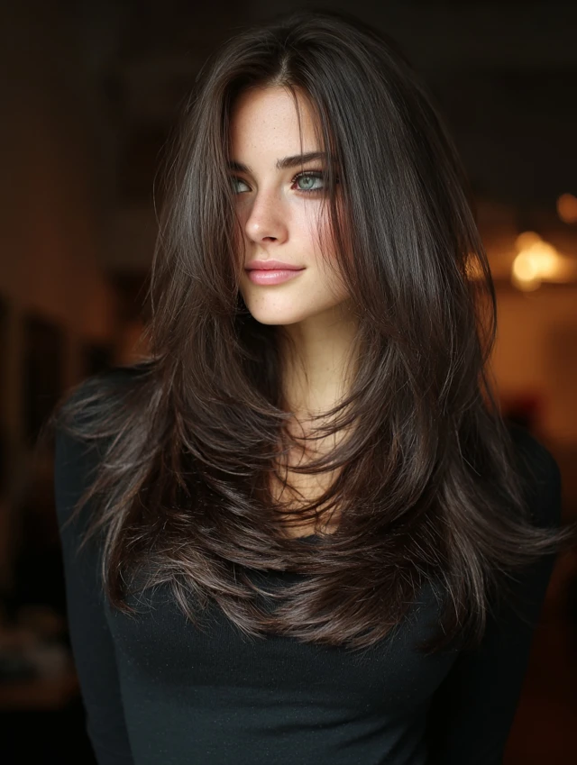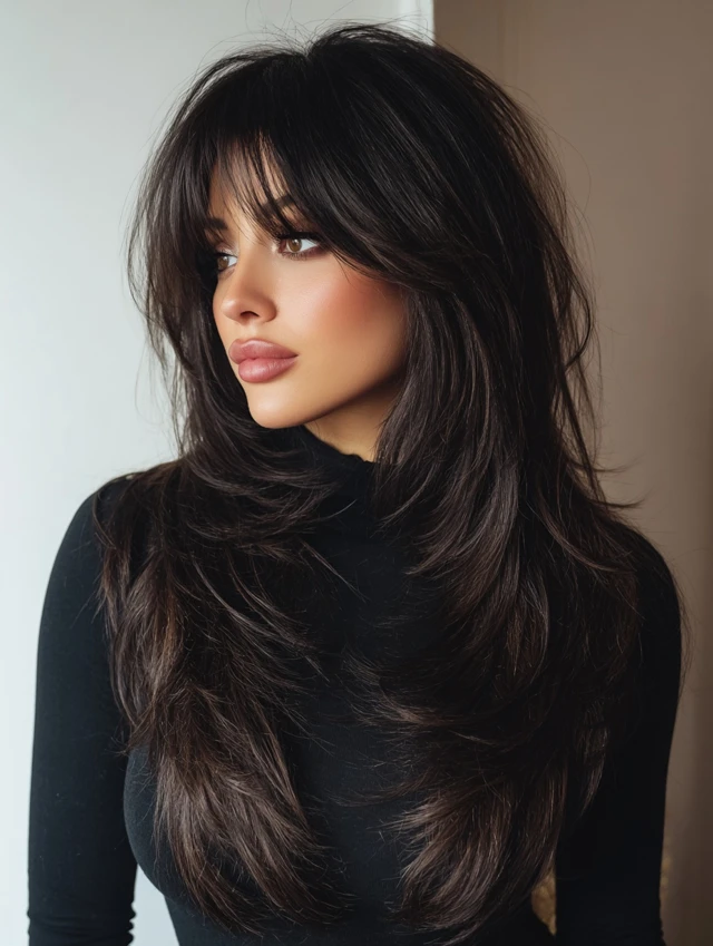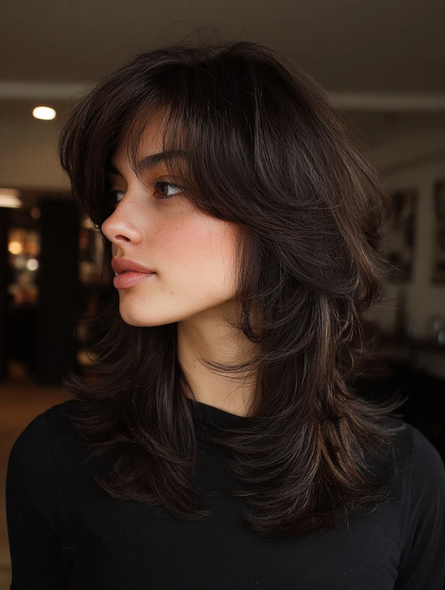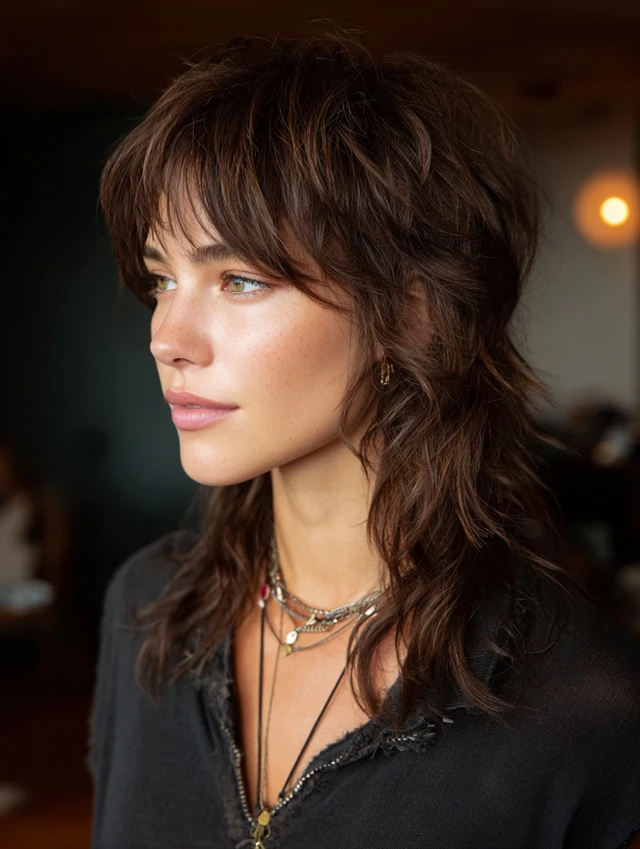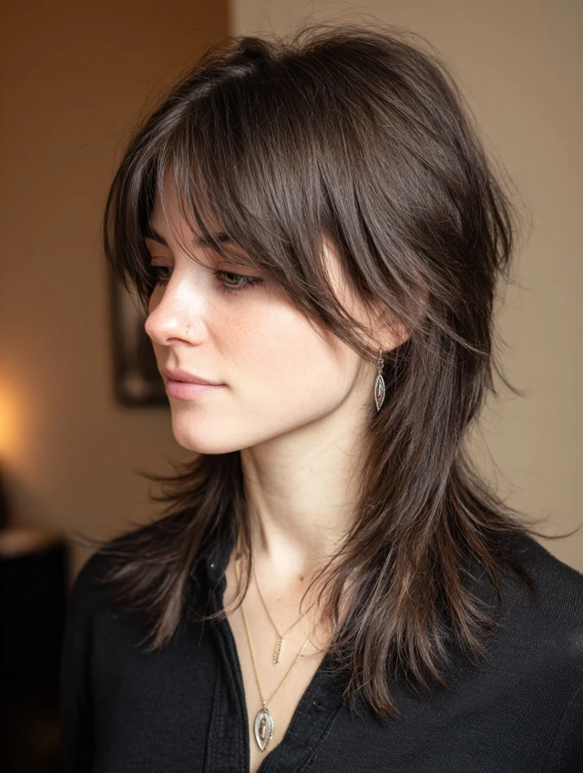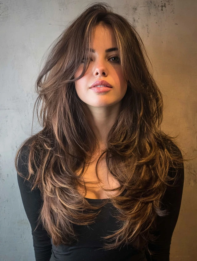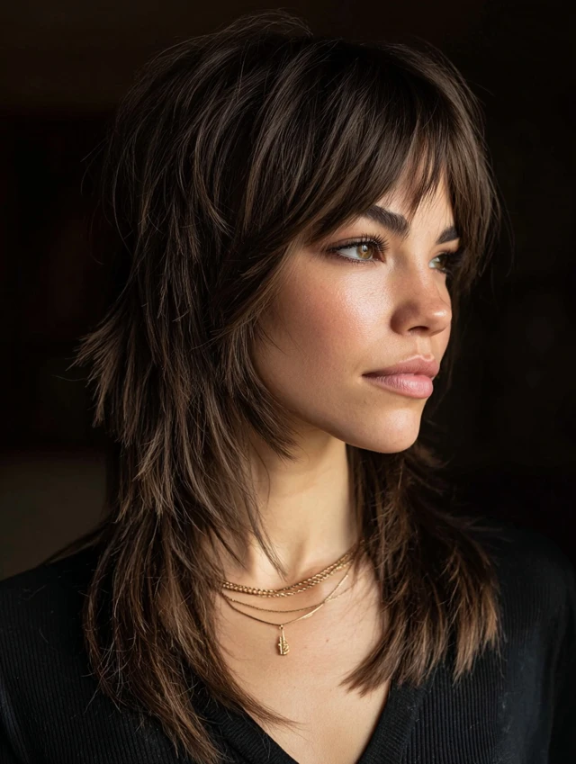 A long wolf cut keeps length while adding dramatic layers. It flatters heart and oval face shapes by adding width near the jaw. Thick hair benefits most from weight removal.