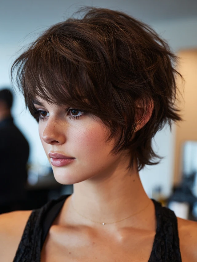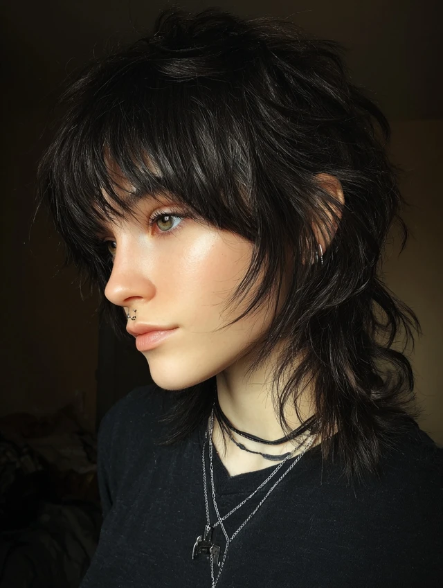 A short wolf cut keeps the layers compact and bold. It flatters round and heart-shaped faces by adding crown height. Fine hair benefits from added lift, while thick hair feels lighter with heavy layering.