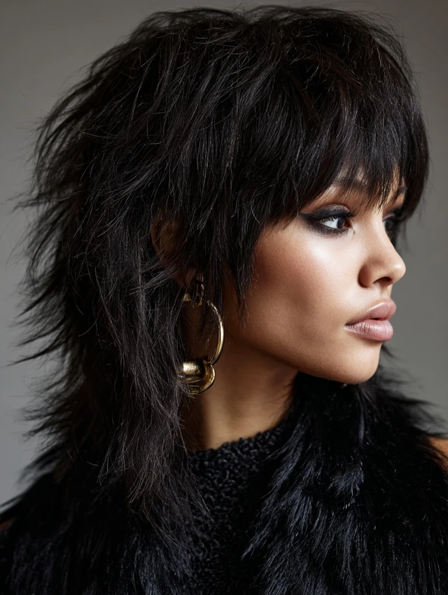 Texture is key. The choppy layers add movement instead of a blunt outline. The wolf cut works because it combines softness around the face with bold volume at the top.