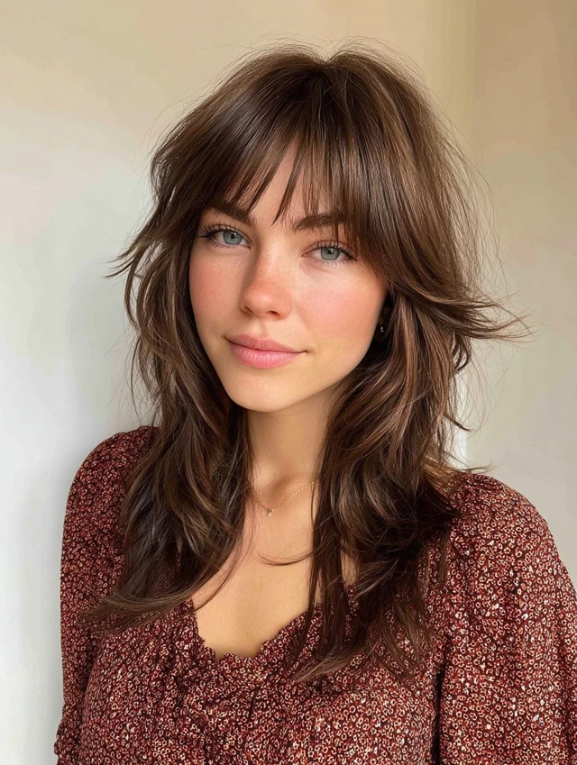 Blow-dry bangs across the forehead for shape. Keep the layers slightly messy. This version feels modern and easy to style daily.