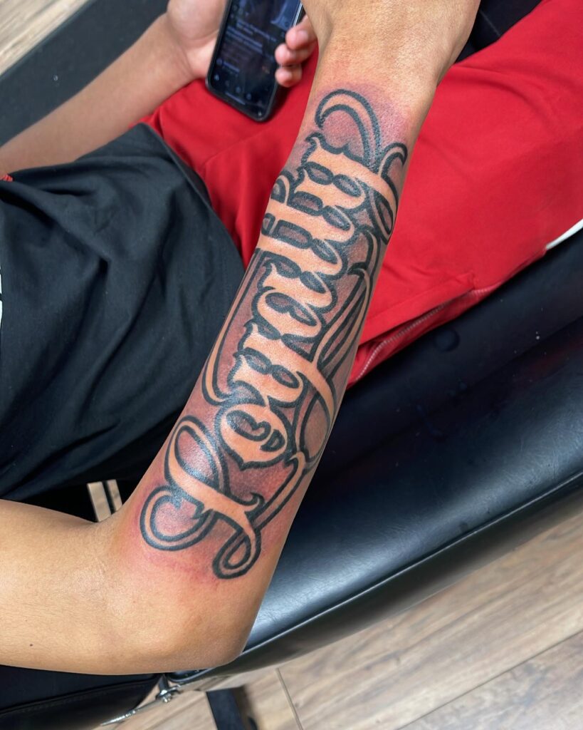 The tattoo feels expressive and balanced, showing how a single word can carry deep emotion. It’s a timeless choice for anyone honoring a loved one or celebrating a name close to their heart.