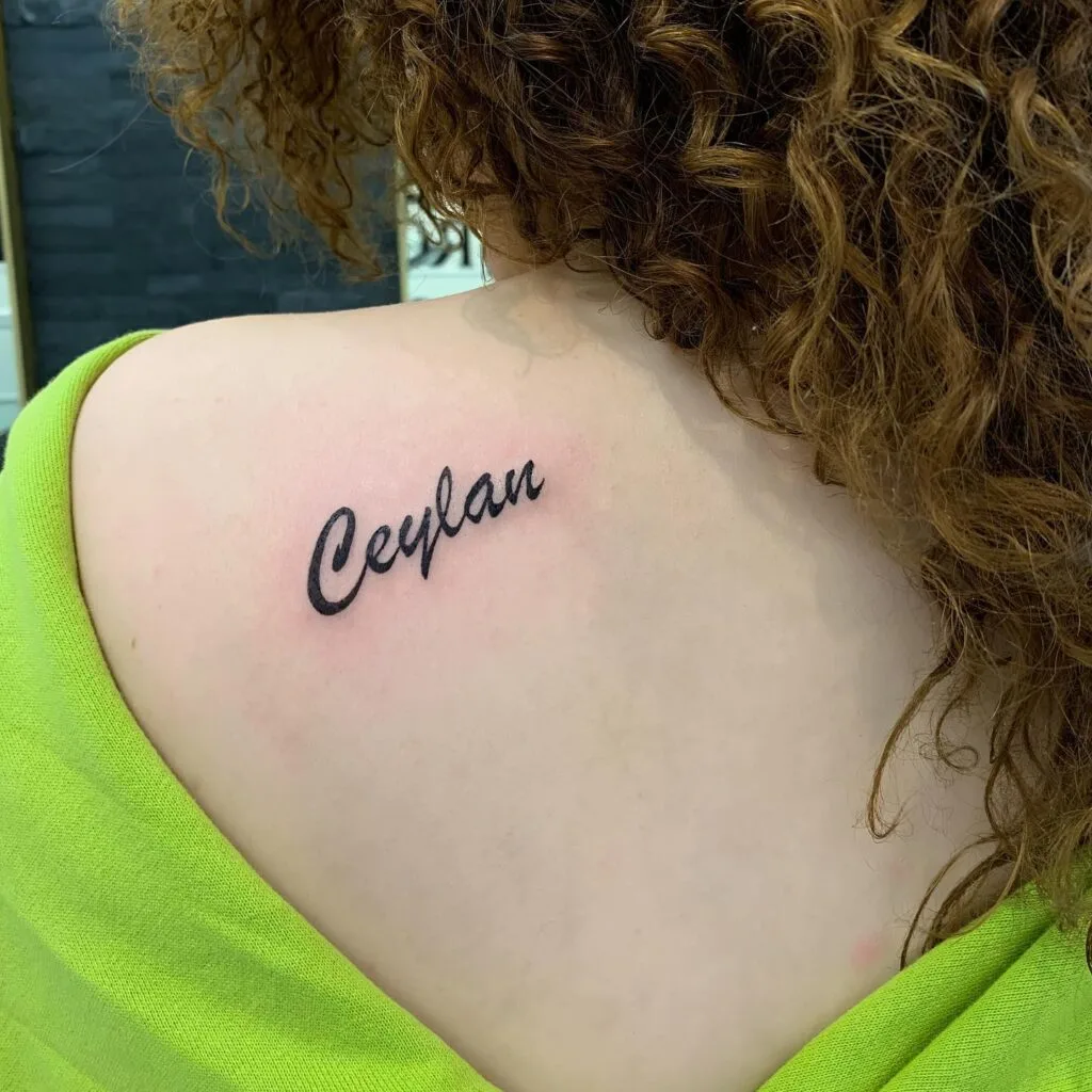 This tattoo features the word “Ceylan” inked in a graceful cursive script on the upper back. The clean, bold strokes make the name stand out beautifully against the skin. Its placement near the shoulder gives it a personal yet subtly visible look, perfect for someone who values understated elegance.