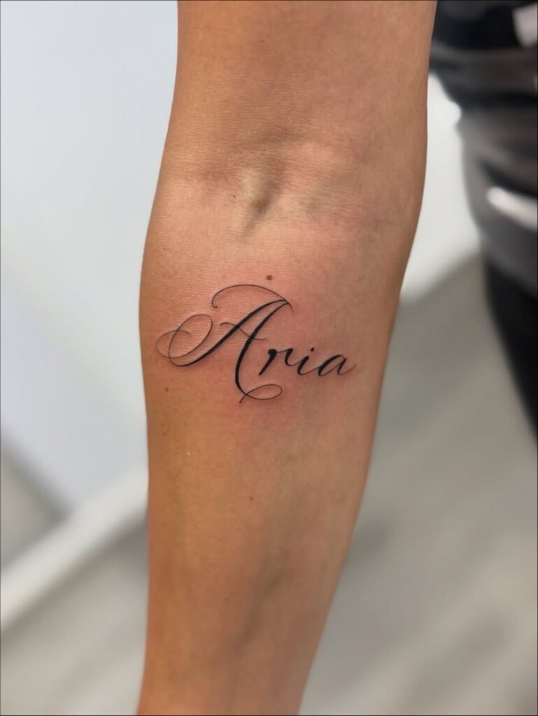 This tattoo displays the name “Aria” in an elegant, flowing script across the inner forearm. The delicate lettering features fine lines and graceful curves that give it a refined and airy appearance. Its placement allows it to be easily seen yet remains personal, adding meaning to its simplicity.
