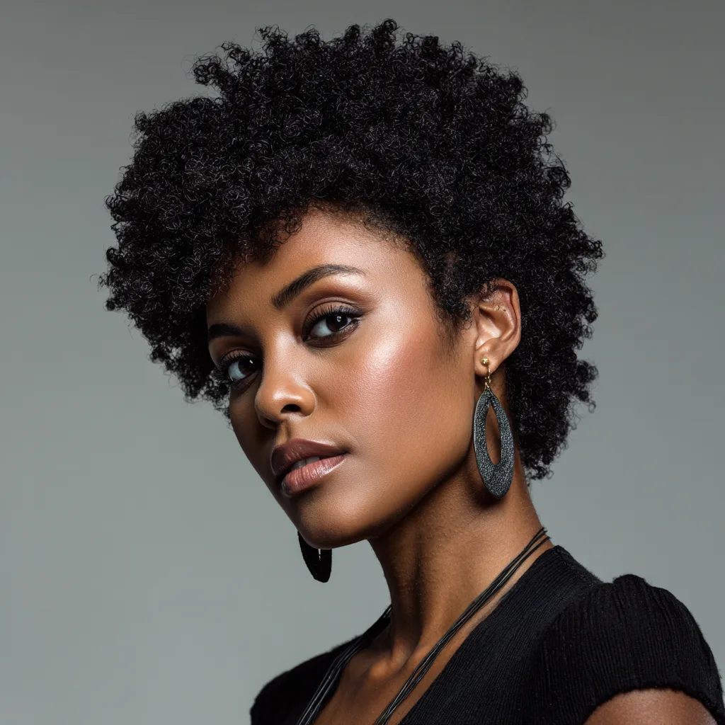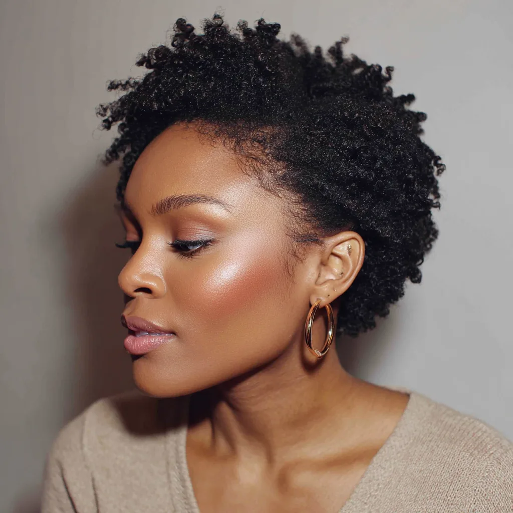 This style gathers natural hair low at the nape, creating a calm and controlled silhouette. It works well for round and oval faces by keeping volume balanced. The puff shows texture without overwhelming facial features. It fits tightly coiled and kinky textures that hold shape with minimal product.