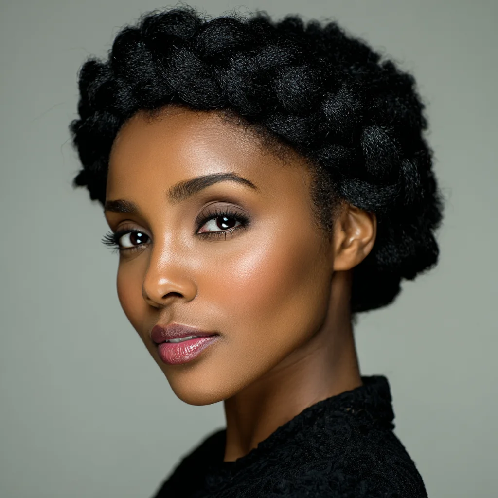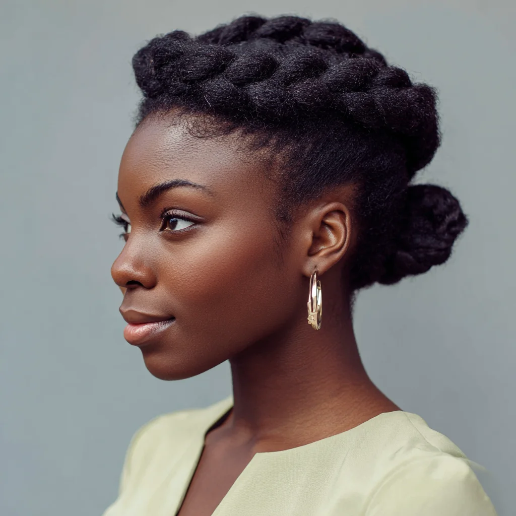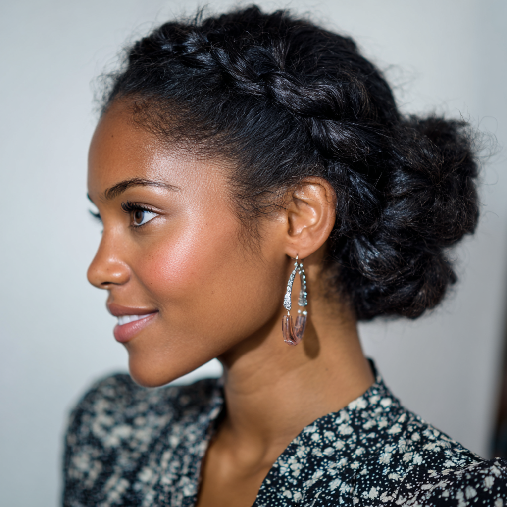 A braided crown wraps hair around the head, creating a balanced and professional outline. It works well for most face shapes by keeping volume evenly distributed. This style suits medium to long natural hair that can braid smoothly.