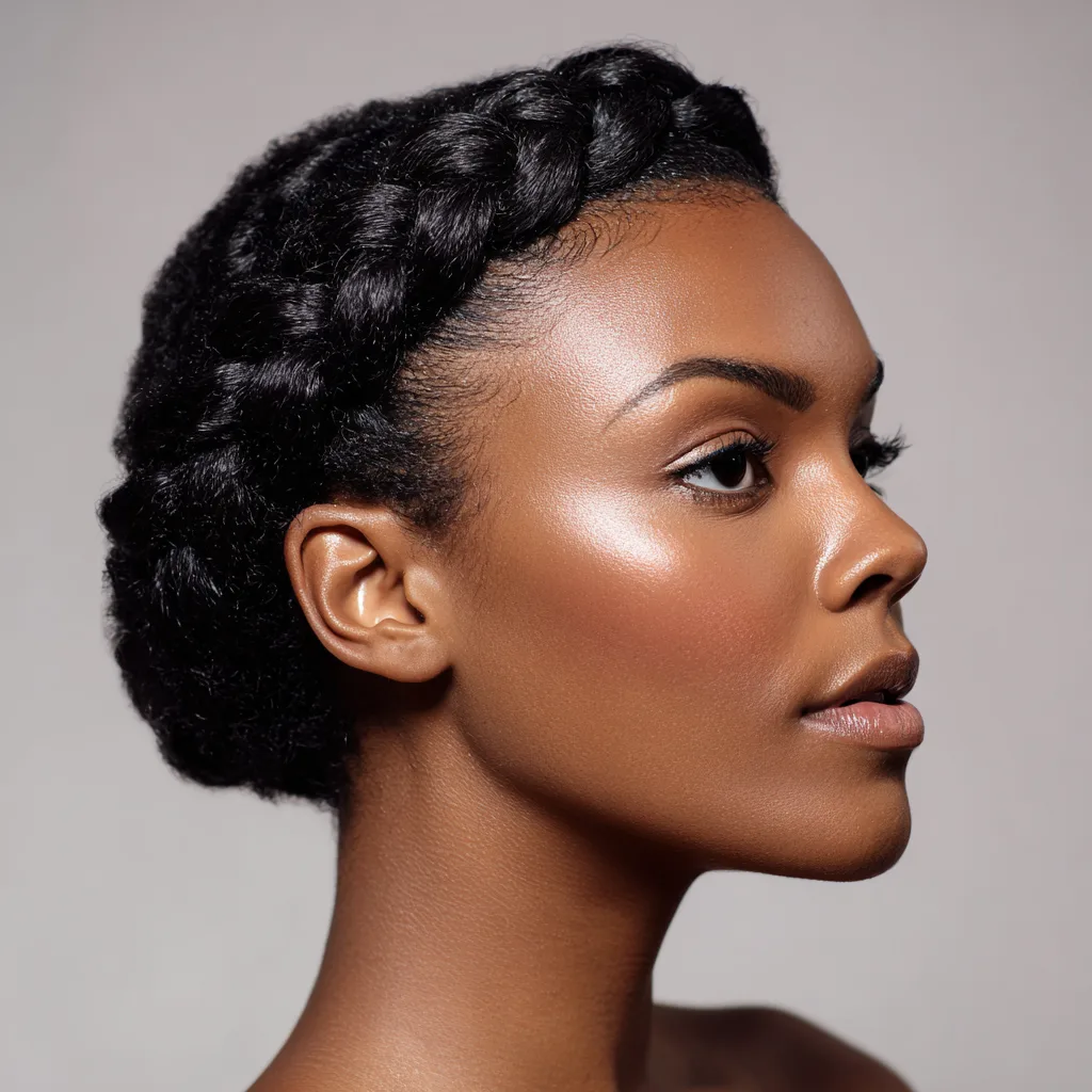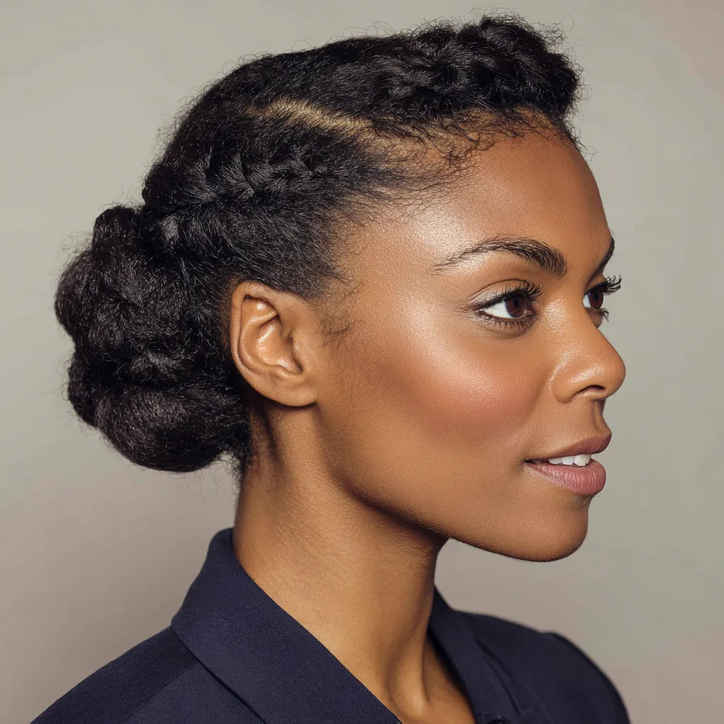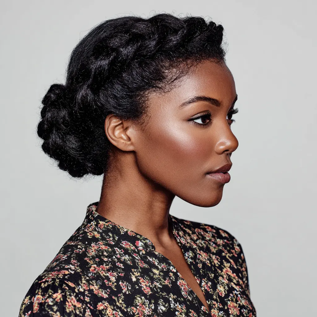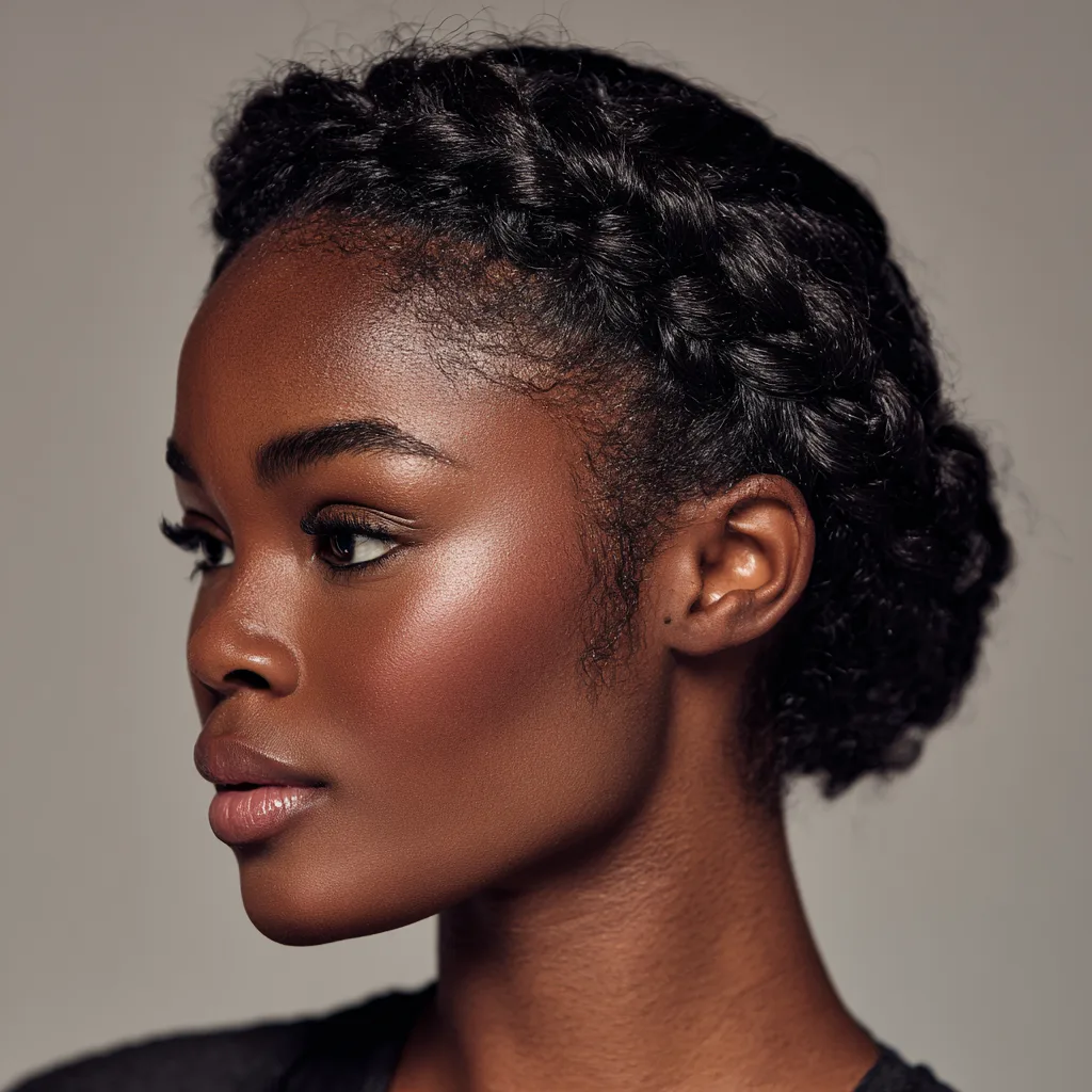 A braided crown wraps hair around the head, creating a balanced and professional outline. It works well for most face shapes by keeping volume evenly distributed. This style suits medium to long natural hair that can braid smoothly.