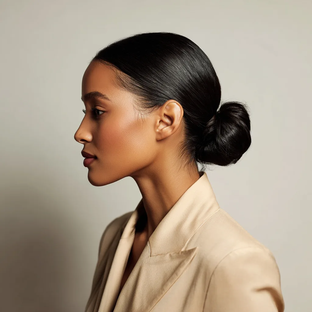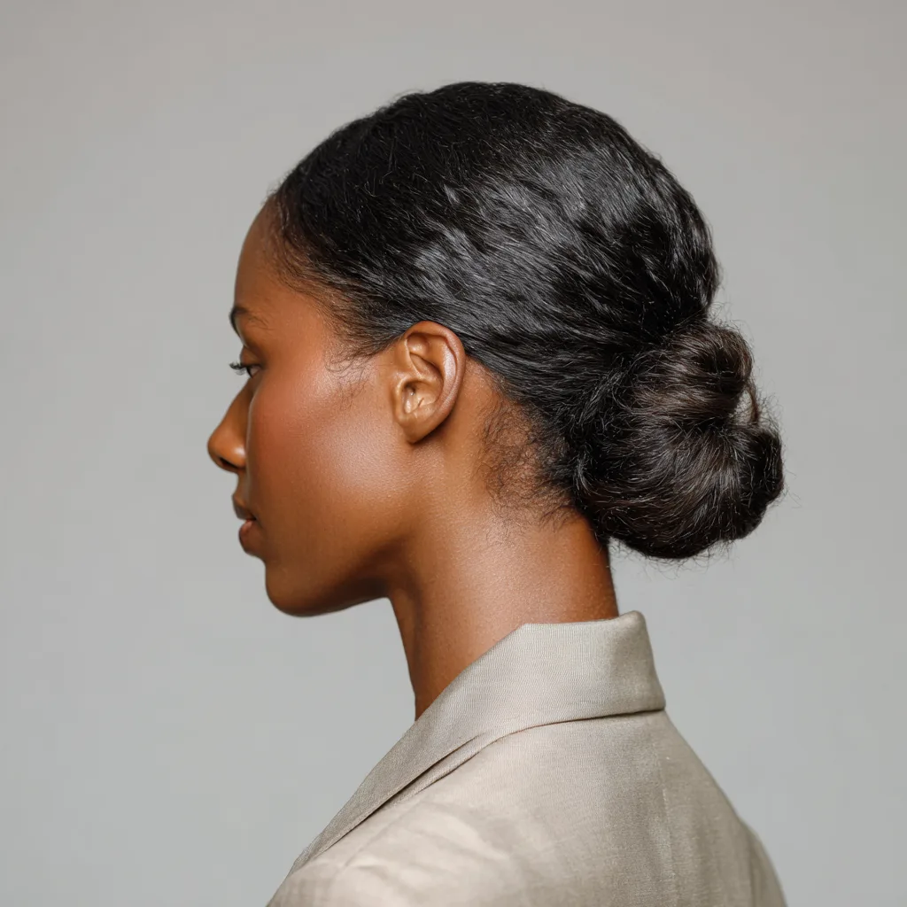 A low bun offers a clean profile that works in conservative or corporate offices. It pulls attention to facial features and works well for square or heart-shaped faces. This style suits stretched natural hair or blow-dried textures that gather smoothly.
